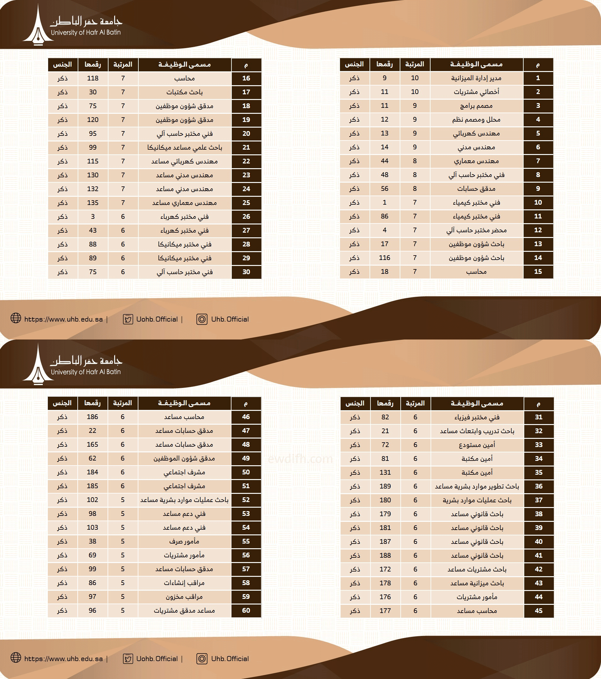 - 1- مُحاسب. 2- باحث مكتبات. 3- مُدقق شؤون موظفين. 4- فني مختبر حاسب آلي. 5- باحث علمي مُساعد. 6- مهندس كهربائي مُساعد. 7- مهندس مدني مُساعد. 8- مُهندس معماري مُساعد. 9- فني مختبر كهرباء. 10- فني مختبر ميكانيكا. 11- فني مختبر حاسب آلي. 12- مدير إدارة الميزانية. 13- أخصائي مشتريات. 14- مُصمم برامج. 15- مُحلل ومصمم نظم. 16- مهندس كهربائي. 17- مهندس مدني. 18- مهندس معماري. 19- مدقق حسابات. 20- فني مختبر كيمياء. 21- محضر حاسب آلي. 22- باحث شوؤن موظفين. 23- فني مختبر فيزياء. 24- باحث تدريب وابتعاث. 25- أمين مستودع. 26- أمين مكتبة. 27- باحث تطوير موارد بشرية مساعد. 28- باحث عمليات موارد بشرية. 29- باحث قانوني مساعد. 30- باحث مشتريات مساعد. 31- باحث ميزانية مساعد. 32- مأمور مشتريات. 33- محاسب مساعد. 34- مدقق حسابات مساعد. 35- مشرف اجتماعي. 36- فني دعم مساعد. 37- مأمور صرف. 38- مأمور مشتريات. 39- مراقب انشاءات. 40- مراقب مخزون. 41- مساعد مدقق مشتريات
