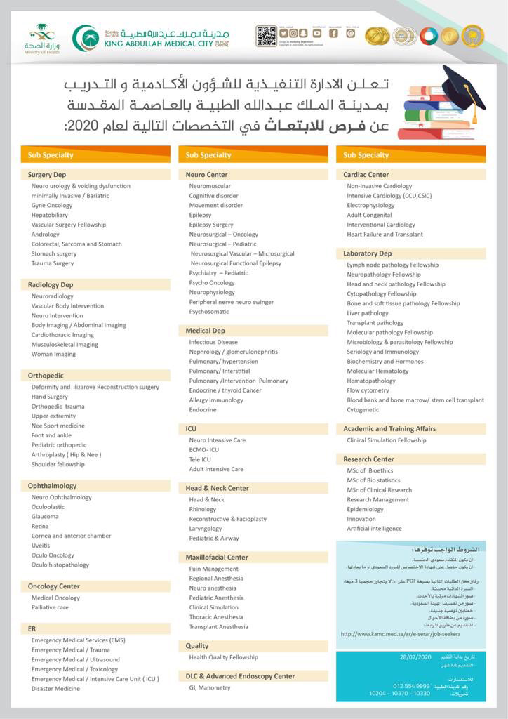 اعلنت مدينة الملك عبدالله الطبية بالعاصمة المقدسة الإدارة التنفيذية للشؤون الأكاديمية والتدريب عن فتح باب التسجيل في فرص الابتعاث للعام 2020م في مختلف التخصصات الطبية والصحية للرجال والنساء على النحو التالي: