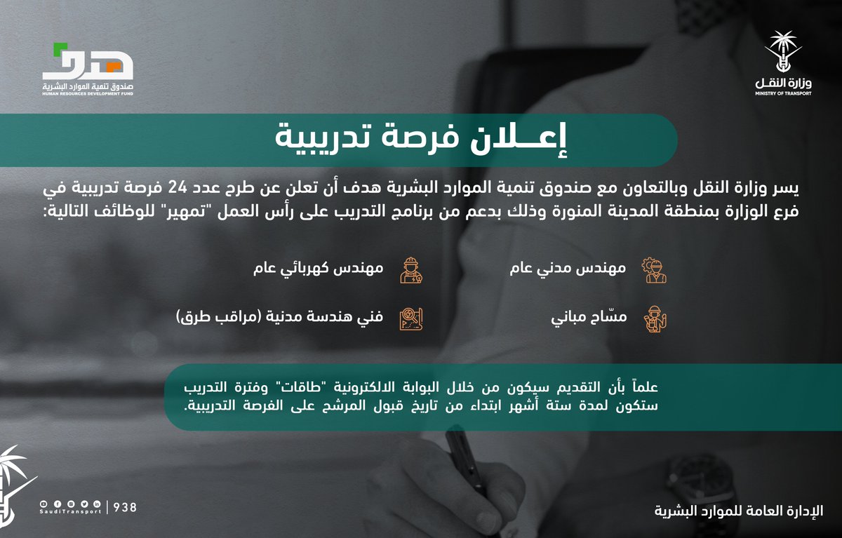 اعلنت وزارة النقل عبر موقعها الإلكتروني توفر أكثر من 20 فرصة تدريبية شاغرة بمنطقة المدينة المنورة عبر تمهير، وذلك وفقا للتفاصيل وطريقة التقديم الموضحة أدناه.