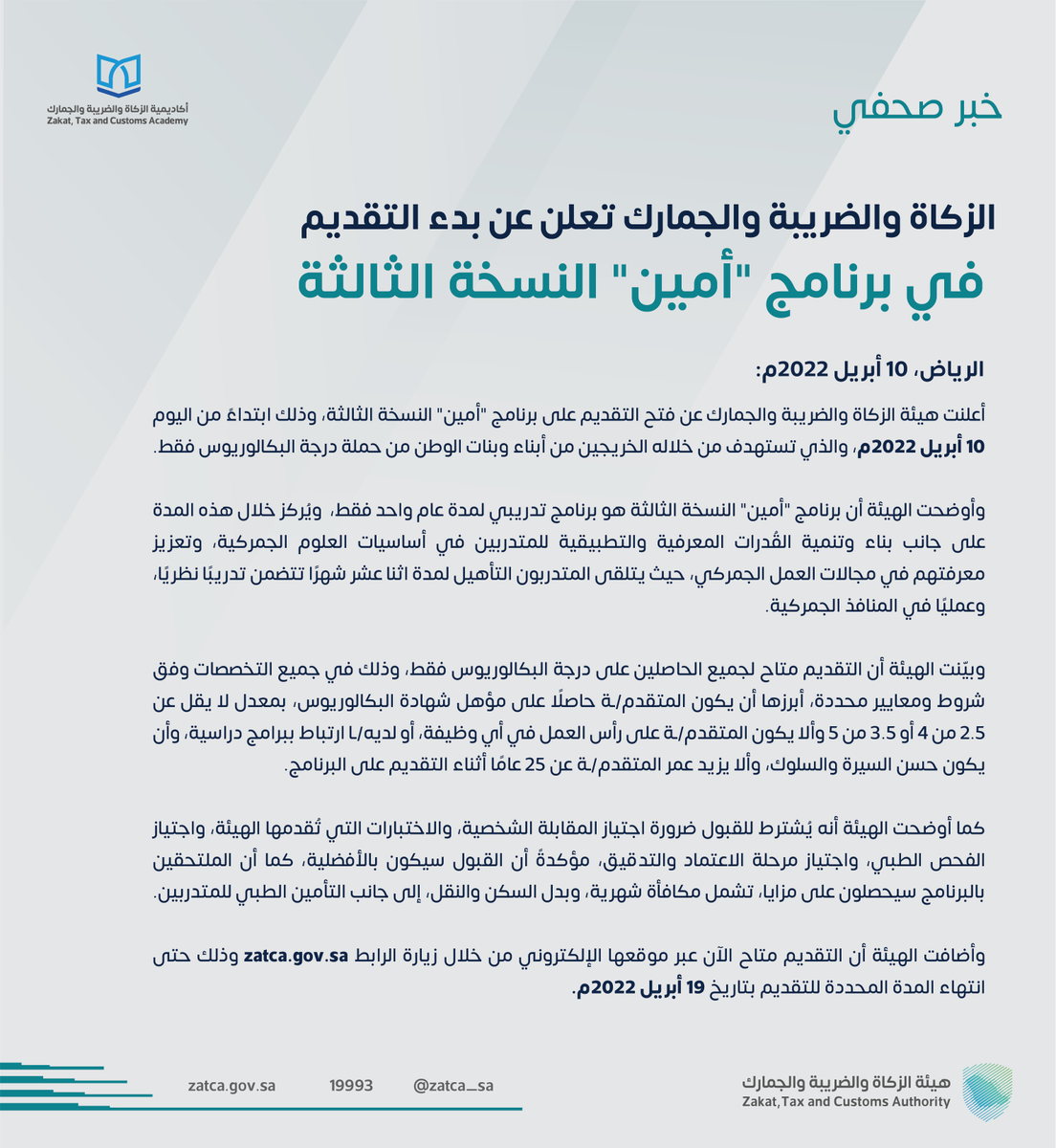 اعلنت هيئة الزكاة والضريبة والجمارك عن فتح التقديم على برنامج (أمين) النسخة الثالثة، والذي تستهدف من خلاله الخريجين من أبناء وبنات الوطن من حملة درجة البكالوريوس فقط (جميع التخصصات)، وذلك وفقا للتفاصيل الموضحة أدناه.