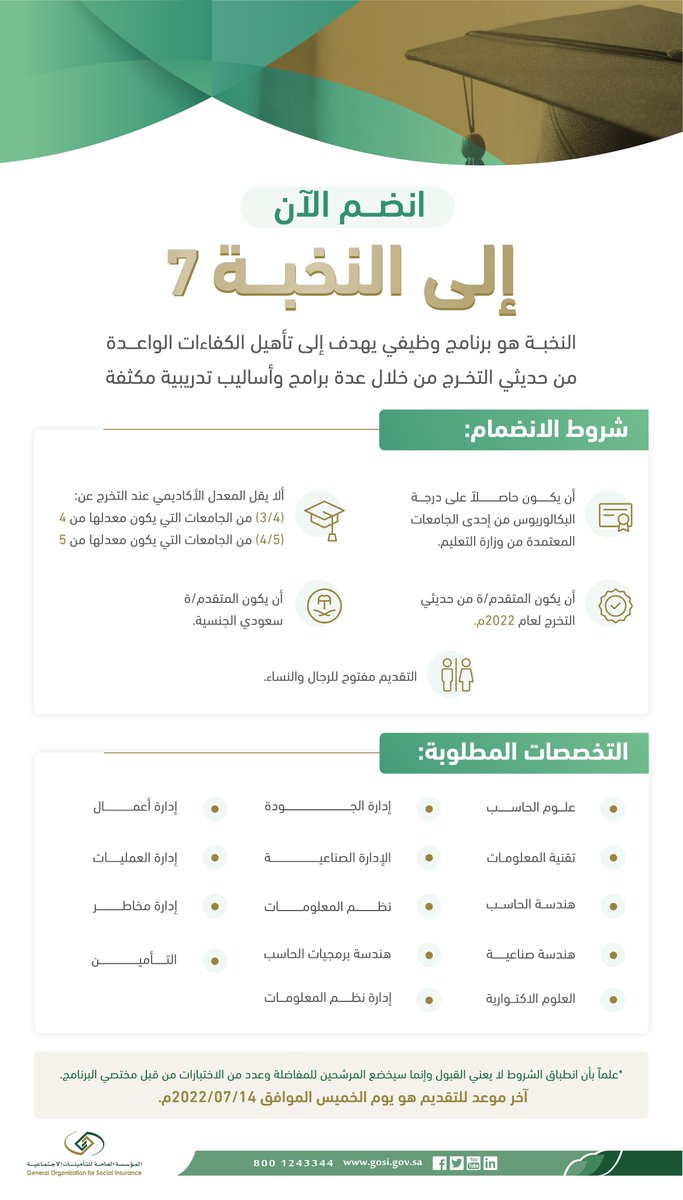 المؤسسة العامة للتأمينات الاجتماعية بدء التقديم (رجال / نساء) في برنامج (النخبة لتطوير المواهب) المنتهي بالتوظيف للعام 2022م بمدينة الرياض، من حملة البكالوريوس في مختلف التخصصات، ويهدف برنامج النخبة إلى تأهيل الكفاءات الواعدة من حديثي التخرج، وتسريع عملية بناء الكفاءات الخاصة بهم من خلال عدة برامج تدريبية مكثفة، كما أن البرنامج يهتم بتدريب وتطوير الملتحقين لزيادة قدراتهم وتزويدهم بمعرفة متقدمة حول كيفية عمل جميع الإدارات في المؤسسة، وذلك وفقاً للتفاصيل وطريقة التقديم الموضحة أدناه.
