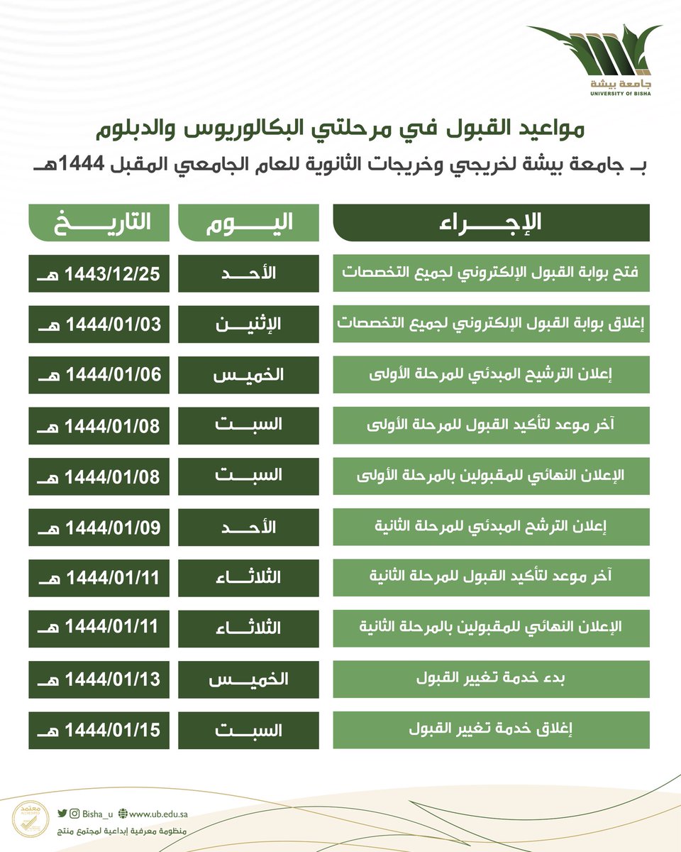 | الموعد: | جامعة بيشة موعد فتح بوابة القبول الإلكتروني للعام الجامعي القادم 1444هـ |