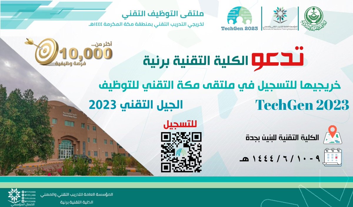 تعلن ( الكلية التقنية ) عبر حسابها الرسمي ( تويتر ) عن إقامة ملتقى مكة التقني ( الجيل التقني للتوظيف 2023م ) بمختلف التخصصات الذي سيوفر أكثر من (10,000 وظيفة)، وذلك وفقاً للتفاصيل والشروط الآتية.