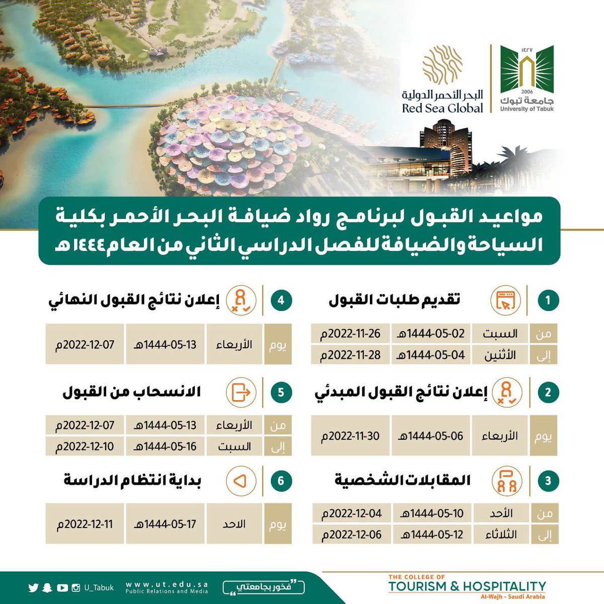 اعلنت جامعة تبوك عن (برنامج رواد ضيافة البحر الأحمر المنتهي بالتوظيف) في تخصصي إدارة الضيافة وإدارة الأغذية والمشروبات بكلية السياحة والضيافة بمحافظة الوجه للفصل الدراسي الثاني من العام 1444هـ، وذلك وفقاً للتفاصيل وطريقة التقديم الموضحة أدناه.