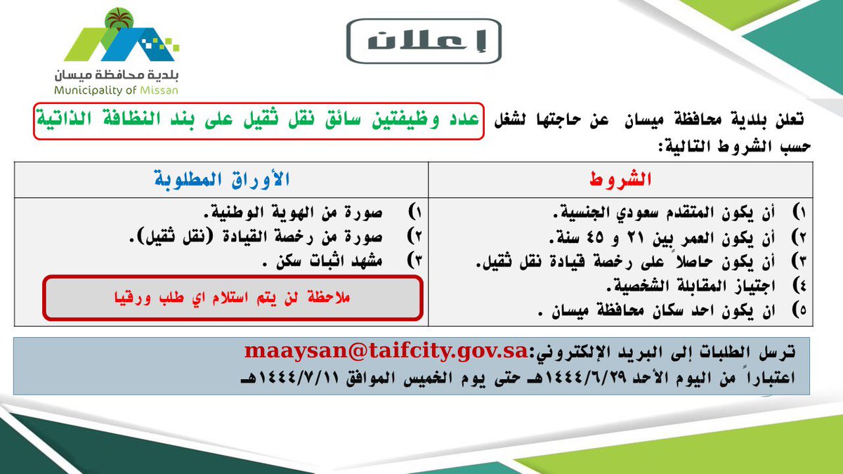 بلدية محافظة ميسان التابعة لأمانة محافظة الطائف توفر وظائف شاغرة (سائقين) على بند النظافة الذاتية، واشترطت البلدية أن يكون المتقدم سعودي الجنسية، وذلك وفقاً للتفاصيل الموضحة أدناه.