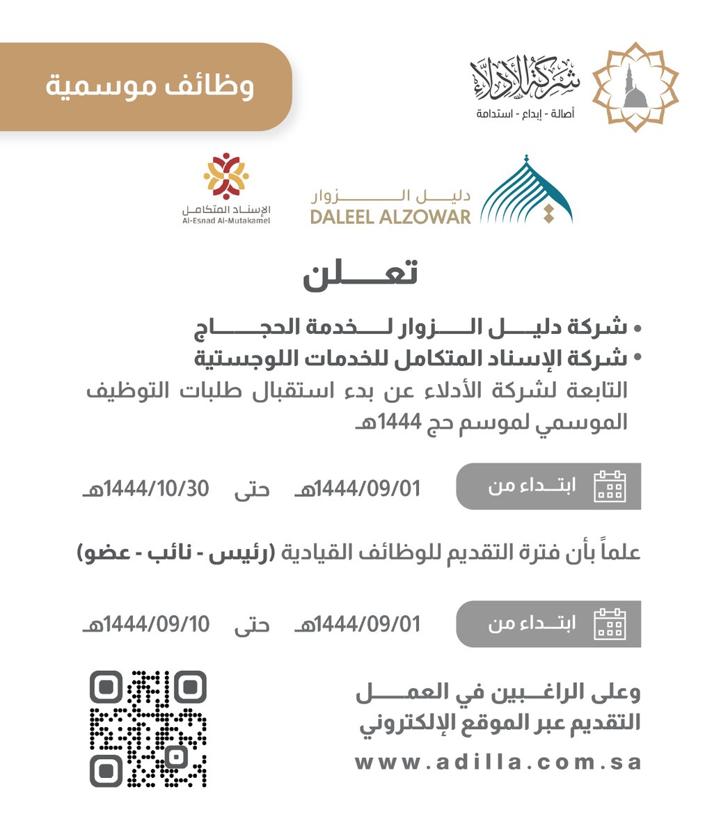 شركة الأدلاء بدء استقبال طلبات التوظيف الموسمي لموسم حج 1444هـ للعمل في الشركات التابعة لها (شركة دليل الزوار لخدمة الحجاج بالمدينة المنورة) و (شركة الإسناد المتكامل للخدمات اللوجستية)، وذلك وفقاً للتفاصيل وطريقة التقديم الموضحة أدناه.