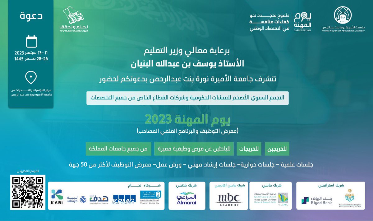 اعلنت جامعة الأميرة نورة بنت عبدالرحمن إقامة (يوم المهنة 2023) برعاية معالي وزير التعليم، الأستاذ يوسف بن عبدالله البنيان، تدعوكم لحضور الملتقى الذي يشمل (معرض التوظيف والبرنامج العلمي المصاحب)، وذلك وفقاً للتفاصيل الموضحة أدناه.