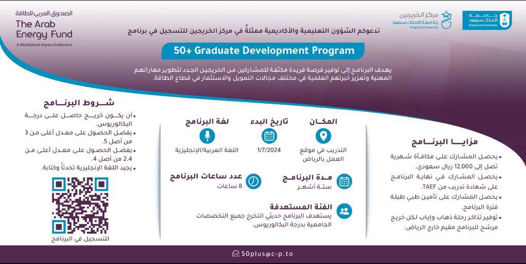 الصندوق العربي للطاقة يعلن (برنامج تطوير الخريجين 50+) مع مكافأة تصل 12 ألف ريال