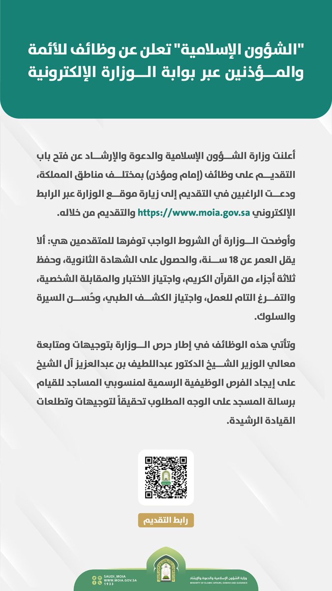 وزارة الشؤون الإسلامية تعلن عن وظائف للأئمة والمؤذنين لحملة الثانوية فأعلى بمختلف مناطق المملكة