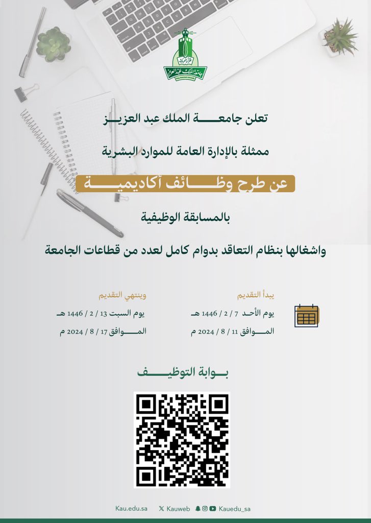 اعلنت جامعة الملك عبدالعزيز مُمثلة بالإدارة العامة للموارد البشرية عن وظائف أكاديمية عن طريق (المسابقة الوظيفية) بنظام التعاقد بدوام كامل، وذلك وفقًا للتفاصيل الموضحة أدناه.
