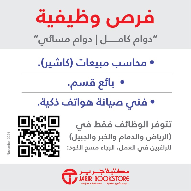 اعلنت مكتبة جرير فتح باب التوظيف (رجال / نساء) لكافة المؤهلات في عدة مناطق المملكة (الرياض والدمام والخبر والجبيل)، واشترطت الشركة أن يكون المتقدم أو المتقدمة سعودي الجنسية، وذلك وفقاً للتفاصيل وطريقة التقديم الموضحة أدناه.