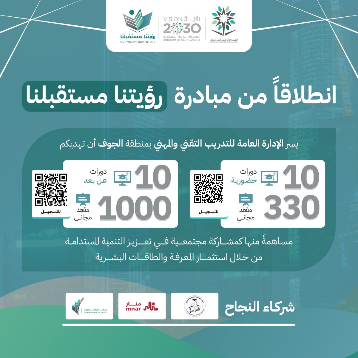 التدريب التقني بالجوف يعلن أكثر من 1330 مقعدٍ مجاني في 20 دورة تدريبية