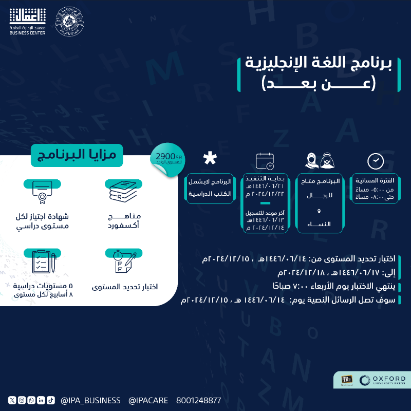 اعلن معهد الإدارة العامة مُمثلاً في مركز الأعمال فتح التسجيل (رجال / نساء) في برامج اللغة الإنجليزية 2025م، وذلك وفقاً للتفاصيل وطريقة التسجيل الموضحة أدناه.