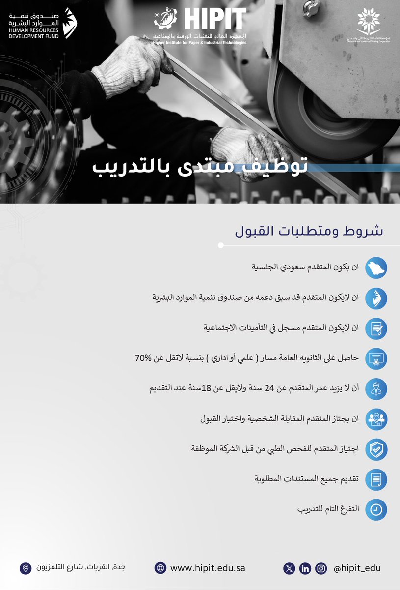 اعلن المعهد العالي للتقنيات الورقية والصناعية (HIPIT) بجدة عن فتح باب القبول والتسجيل في برنامج التدريب المبتدئ بالتوظيف في عدة تخصصات، وذلك وفقًا للتفاصيل وطريقة التقديم الموضحة أدناه.