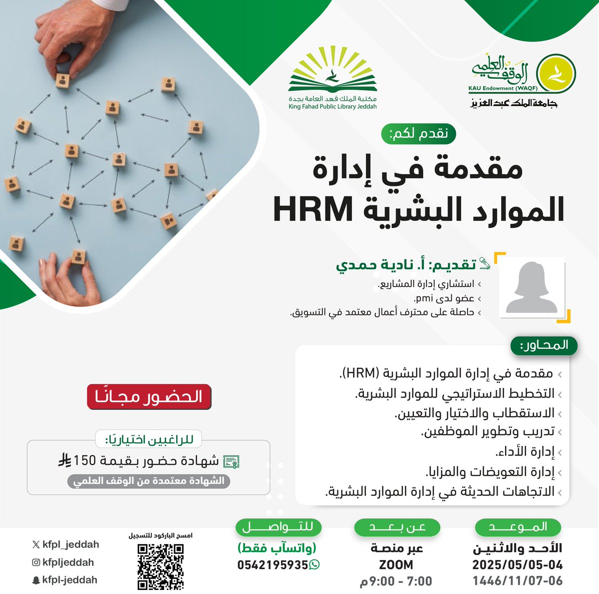 اعلنت مكتبة الملك فهد العامة بجدة التابعة للوقف العلمي بجامعة الملك عبدالعزيز عن إقامة سلسلة من الدورات التدريبية المجانية (عن بُعد)، مع شهادات حضور اختيارية (برسوم) معتمدة من الوقف العلمي، وذلك وفقاً للتفاصيل الموضحة أدناه.