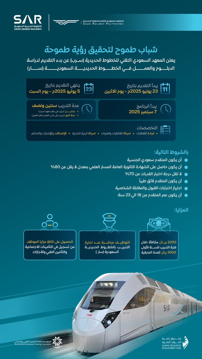 اعلن المعهد السعودي التقني للخطوط الحديدية (سرب) عن بدء التقديم لدراسة الدبلوم والعمل المباشر في الخطوط الحديدية السعودية (سار)، والذي يهدف لتأهيل الكفاءات الوطنية للعمل في قطاع الخطوط الحديدية الواعد، وذلك وفقاً للتفاصيل الموضحة أدناه.