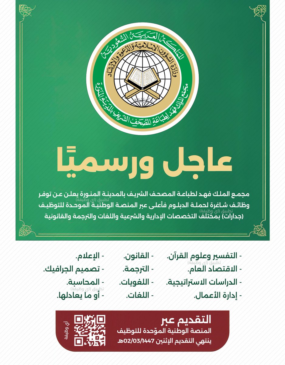 اعلن مجمع الملك فهد لطباعة المصحف الشريف بالمدينة المنورة عن توفر وظائف شاغرة لحملة الدبلوم فأعلى عبر المنصة الوطنية الموحدة للتوظيف (جدارات)، وذلك وفقاً للتفاصيل الموضحة أدناه.