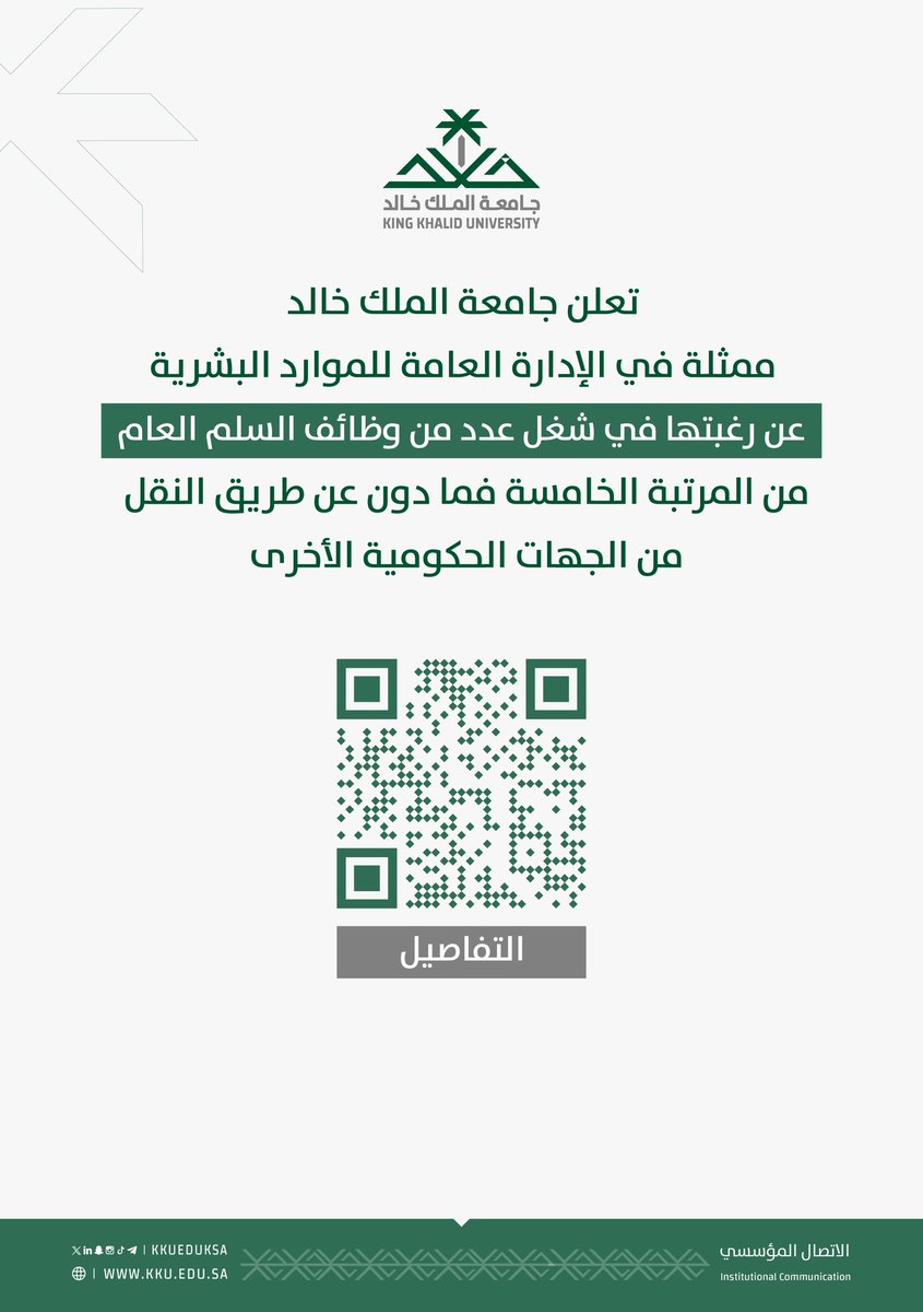 اعلنت جامعة الملك خالد عن رغبتها في شغل عدد من وظائف السلم العام (المرتبة الخامسة فما دون) عن طريق نقل الموظفين من الجهات الحكومية الأخرى، وذلك بهدف استقطاب الكفاءات المتميزة وتعزيز بيئة العمل بالجامعة، وذلك وفقاً للتفاصيل الموضحة أدناه.