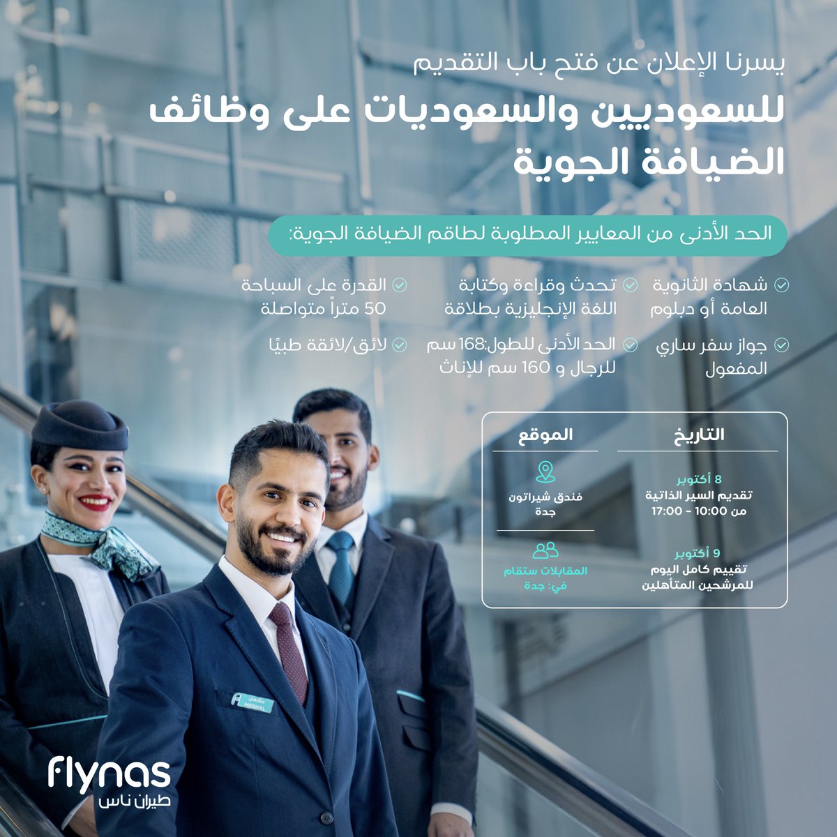 اعلن طيران ناس عن فتح باب التقديم للوظائف الشاغرة في مجال الضيافة الجوية (طاقم الطائرة) للسعوديين والسعوديات بمدينة جدة، مما يوفر فرصًا وظيفية مميزة للانضمام إلى قطاع الطيران الحيوي، وذلك وفقاً للتفاصيل الموضحة أدناه.