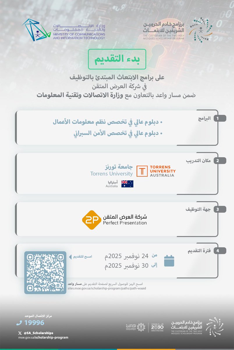 اعلن برنامج خادم الحرمين الشريفين للابتعاث، بالتعاون مع وزارة الاتصالات وتقنية المعلومات، عن فتح باب التقديم على برامج الابتعاث المبتدئ بالتوظيف في شركة العرض المتقن، ضمن مسار (واعد)، للحصول على دبلوم عالٍ في أستراليا، وذلك وفقاً للتفاصيل الموضحة أدناه.