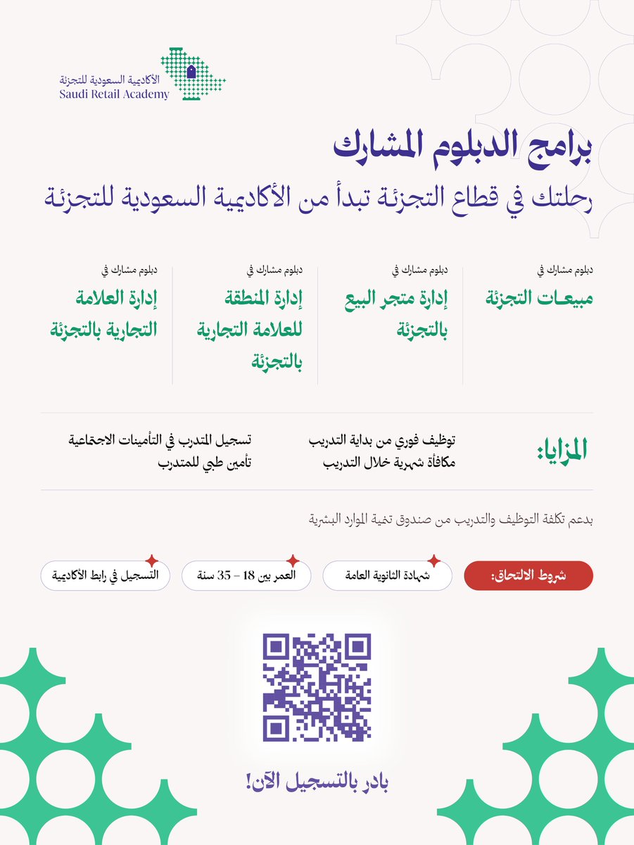 اعلنت الأكاديمية السعودية للتجزئةبالشراكة الإستراتيجية مع المؤسسة العامة للتدريب التقني والمهني وبدعم من صندوق تنمية الموارد البشرية (هدف)، عن فتح باب التقديم في برامج الدبلوم المشارك (تدريب مبتدئ بالتوظيف) في قطاع التجزئة لعام 2026م، وذلك وفقاً للتفاصيل الموضحة أدناه.